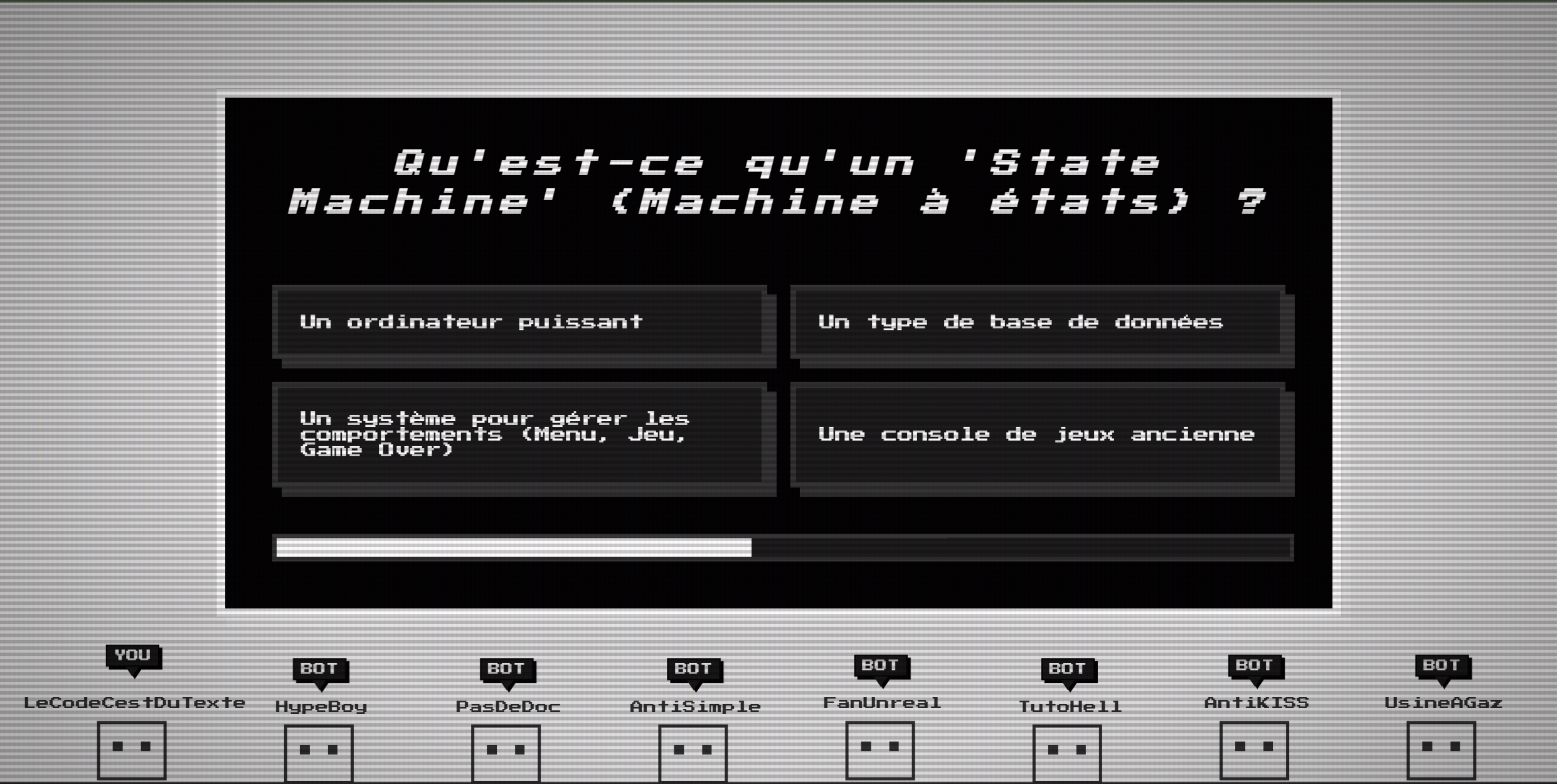 Oui, pour la création d'une base de données de questions/réponses de test, comme outil de consultation de documentation (au lieu d'aller sur Google et de poser une question sur un aspect technique, c'est plus rapide via le chat) et pour les tâches pénibles d'intégration Render. La conception de l'idée du jeu, la game loop frontend/backend, l'architecture générale (state machine Trivia, la gestion et la communication websocket du jeu, etc), c'est du code réfléchi et écrit par moi.